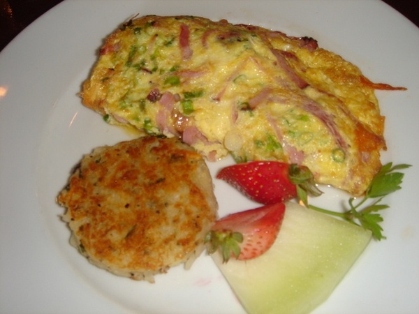 Ham & Cheese plus avocado omelet. It also came with hashbrown, and few slices for fruit. Her omelet is actually really good, they put a lot of chedder cheese, and the special ham is very tastey (maybe is a smoked ham). The portion is just right.