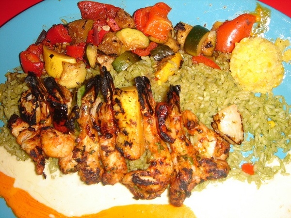 Mike ordered Shrimp Diabla. Grilled shrimp and veggie skewer, beans and sweet corn cake. It should be good since he finsihed them all
