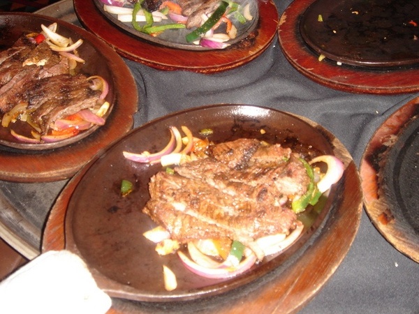 The steak came in the sizzling plate, and the waiter tossed the salad by the tableside.